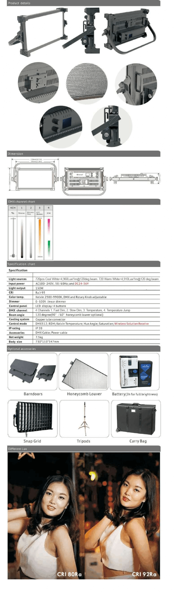 - 3,307lux/1m W29*H12*D5″/W730*H347*D153mm, Beam Angle 120 Degrees. Adjustable white 2500k-9900K